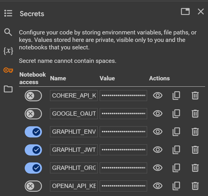 By clicking on the 'key' icon in the Google Colab side menu, you can add these secrets and the values you get from your project in the Graphlit Developer Portal.
