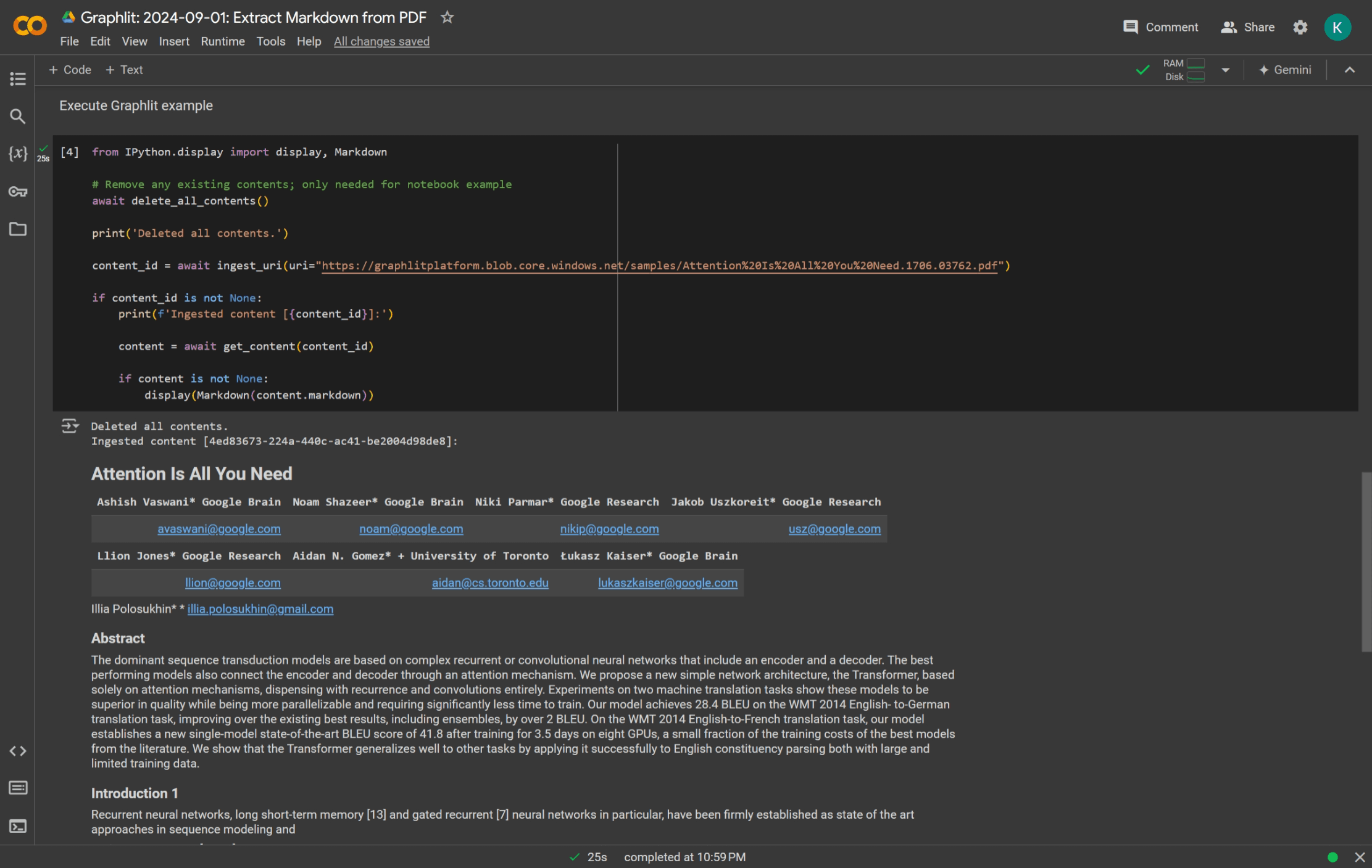 You can see how it has extracted all the text from the "Attention Is All You Need" PDF, and then rendered it in the notebook.