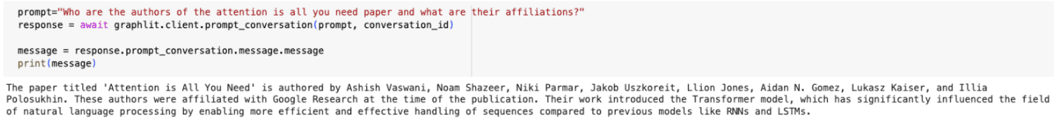 Finally, we can prompt our conversation with the user’s question using the prompt_conversation method and get the response from the LLM. Under the hood, Graphlit is adding our prompt to our conversation. It is also using the specification we used to create the conversation to retrieve relevant context from our vector database. It is then passing the prompt and the context data to OpenAI’s GPT4-turbo model and fetching the response.