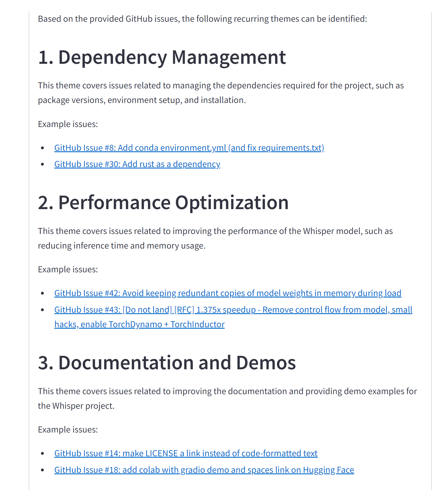 We can use an LLM to find recurring themes in the ingested GitHub issues and then categorize issues into those themes. This can be useful to condense many issues into a few workstreams and can be useful for new open-source contributors to get started on some issues.