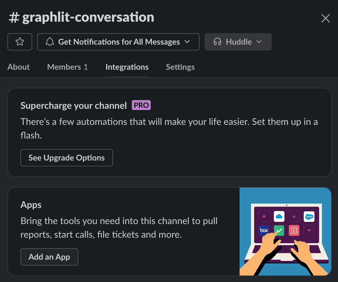 Finally, let’s create a new channel on Slack and add our bot to it. We will use this channel to run our conversational bot. Here I’ve created a new channel named #graphlit-conversation and add Graphlit Bot.