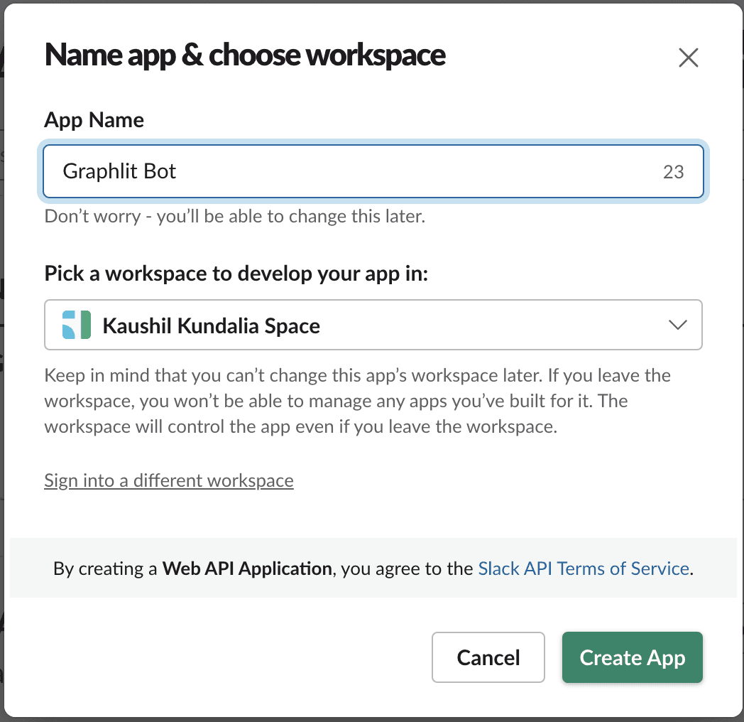 Enter your app’s name (which is “Graphlit Bot” here) and select a workspace. Hit “Create App”: