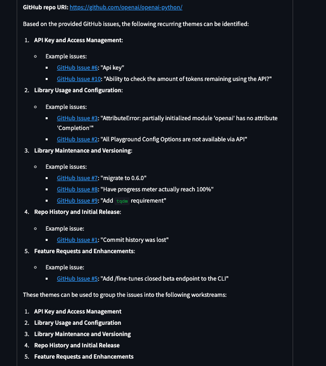 - Learning Curve: Understanding the underlying patterns and common themes in a repository's issues can be educational for beginners. RAG applications facilitate this learning by highlighting recurrent topics, which can help new contributors better understand the project's needs.