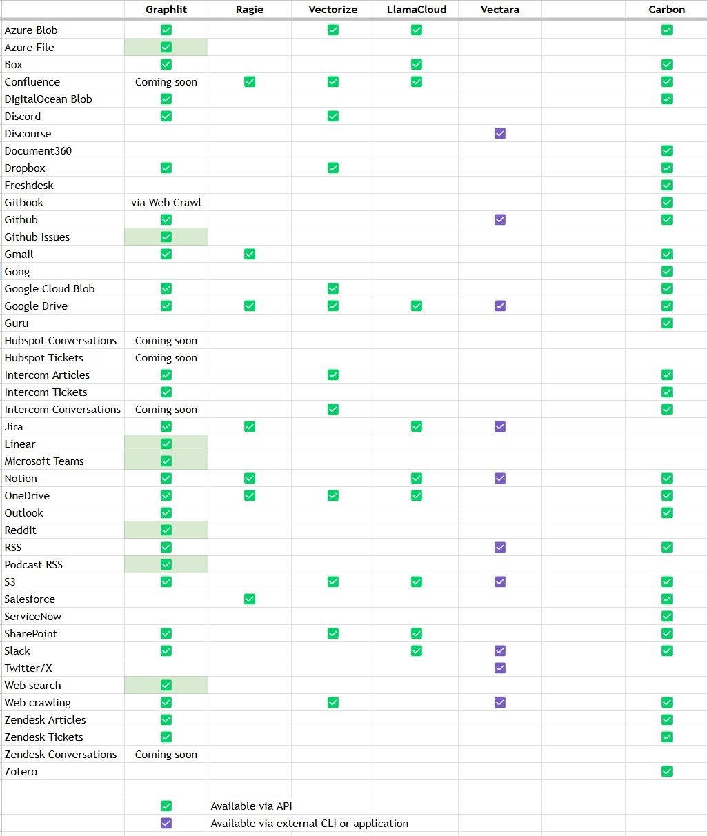 Note, Vectara doesn't appear to have data connectors available via API, but does have an external CLI available, and we've denoted this in the table. Also, we have heard they have Airbyte connectors available.
