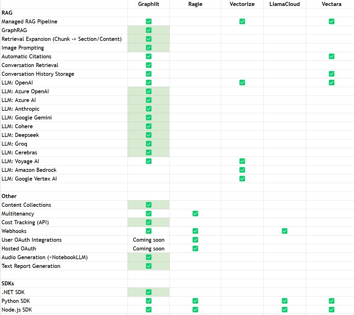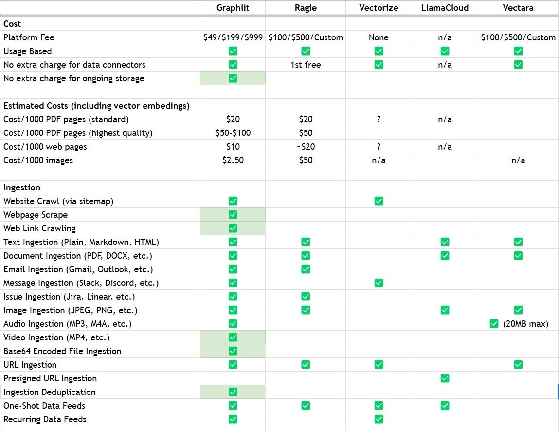 We've put together a comparison sheet of features and data connectors to compare between many of the leading RAG-as-a-Service providers, so you can make your own choice. Data came from vendor websites and API docs.