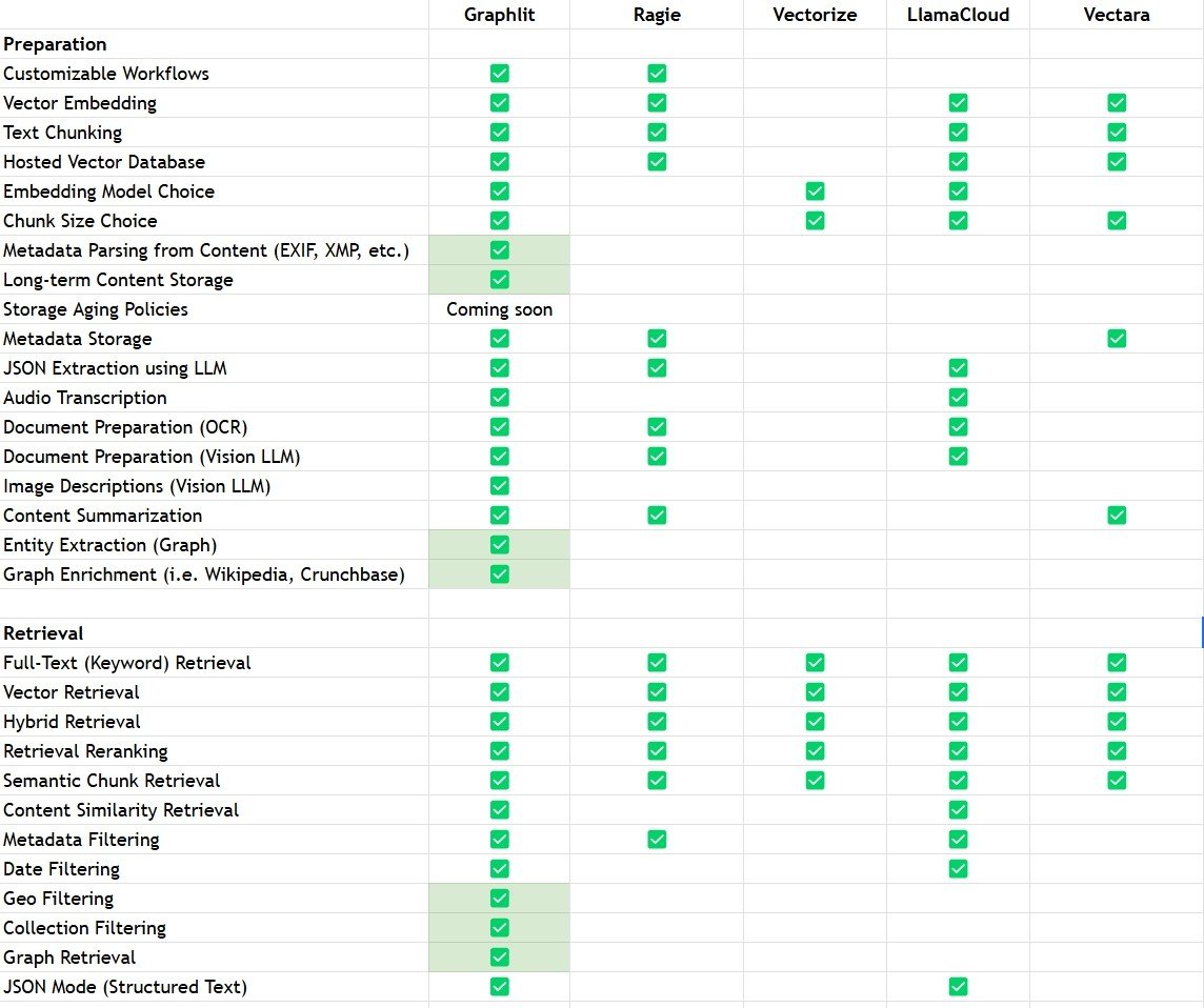 Graphlit stands out because of its knowledge graph data model, which natively supports GraphRAG and graph retrieval. Also we support 'collections' which are grouping of content, like a Gmail label, where content can live in multiple collections.
