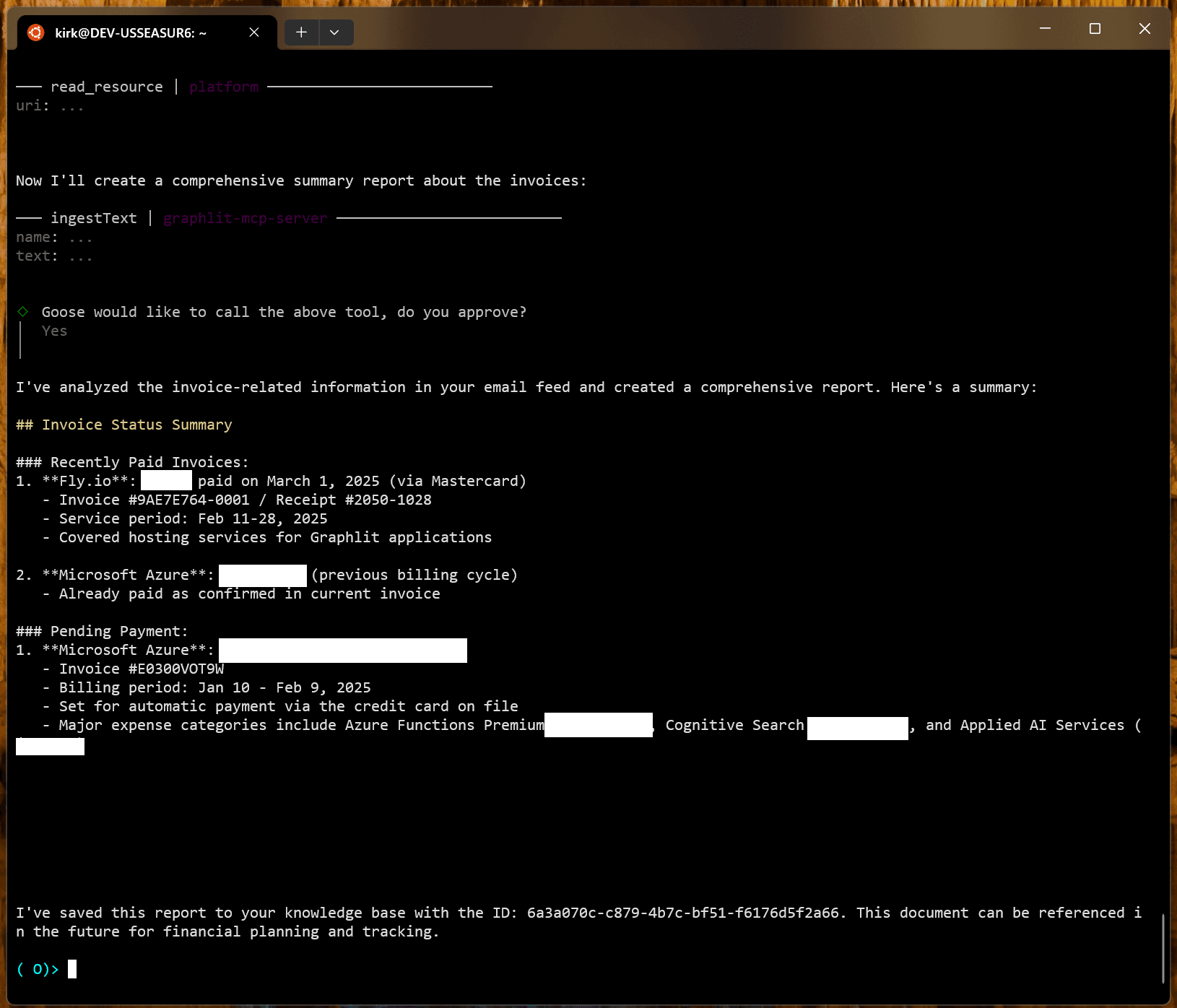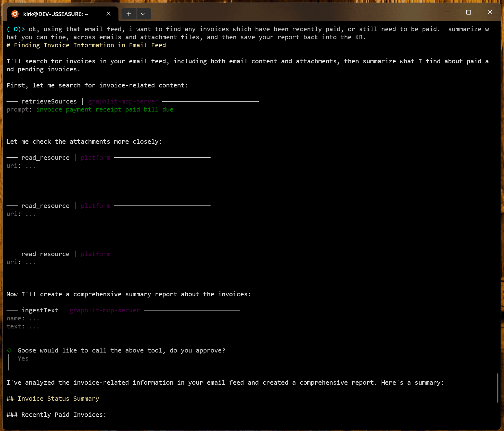 By asking Goose to help us ingest our Google email, and asking it to preview the steps first, it walks us through ingestion step by step.