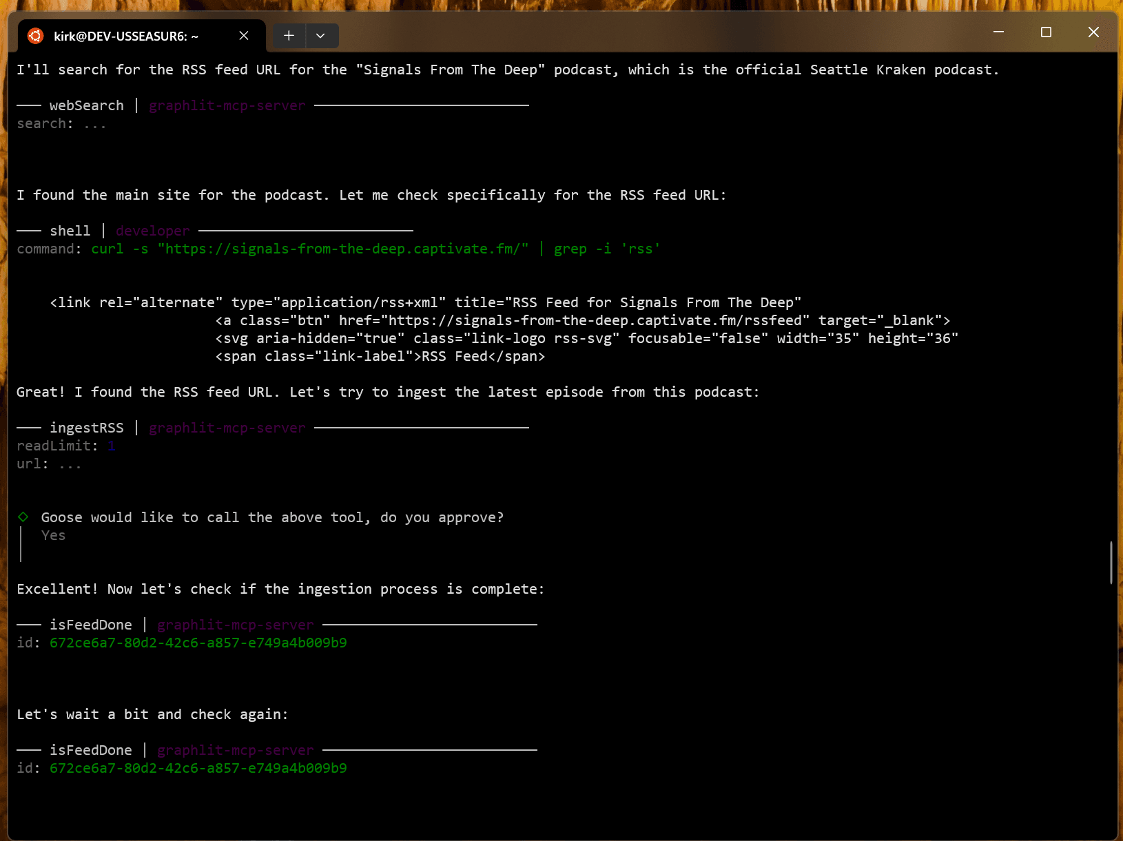 Once Goose locates the RSS URL, it calls 'ingestRSS' to ingest the most recent episode of the podcast, which is automatically transcribed for us.
