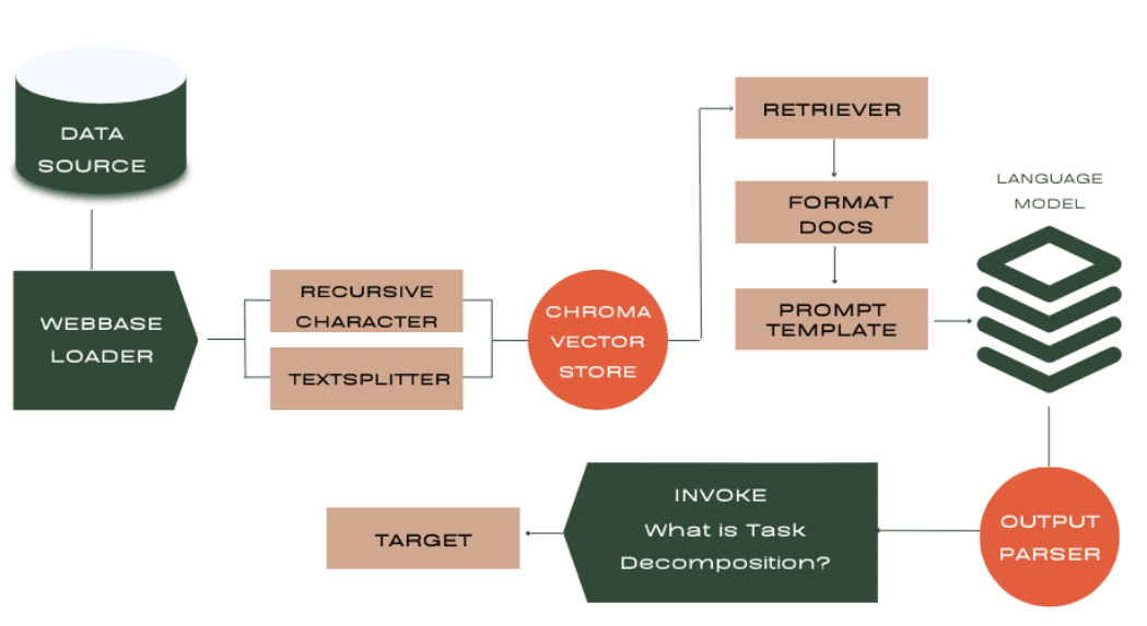 retriever: Retrieves the most relevant chunks from the vectorstore based on the query.format\_docs: A custom function that concatenates the retrieved chunks into a single string.prompt: A pre-defined prompt template that takes the context (retrieved chunks) and the question as inputs.llm: The language model (in this case, gpt-3.5-turbo-0125) that generates the answer based on the formatted prompt.StrOutputParser: Parses the generated output into a string.