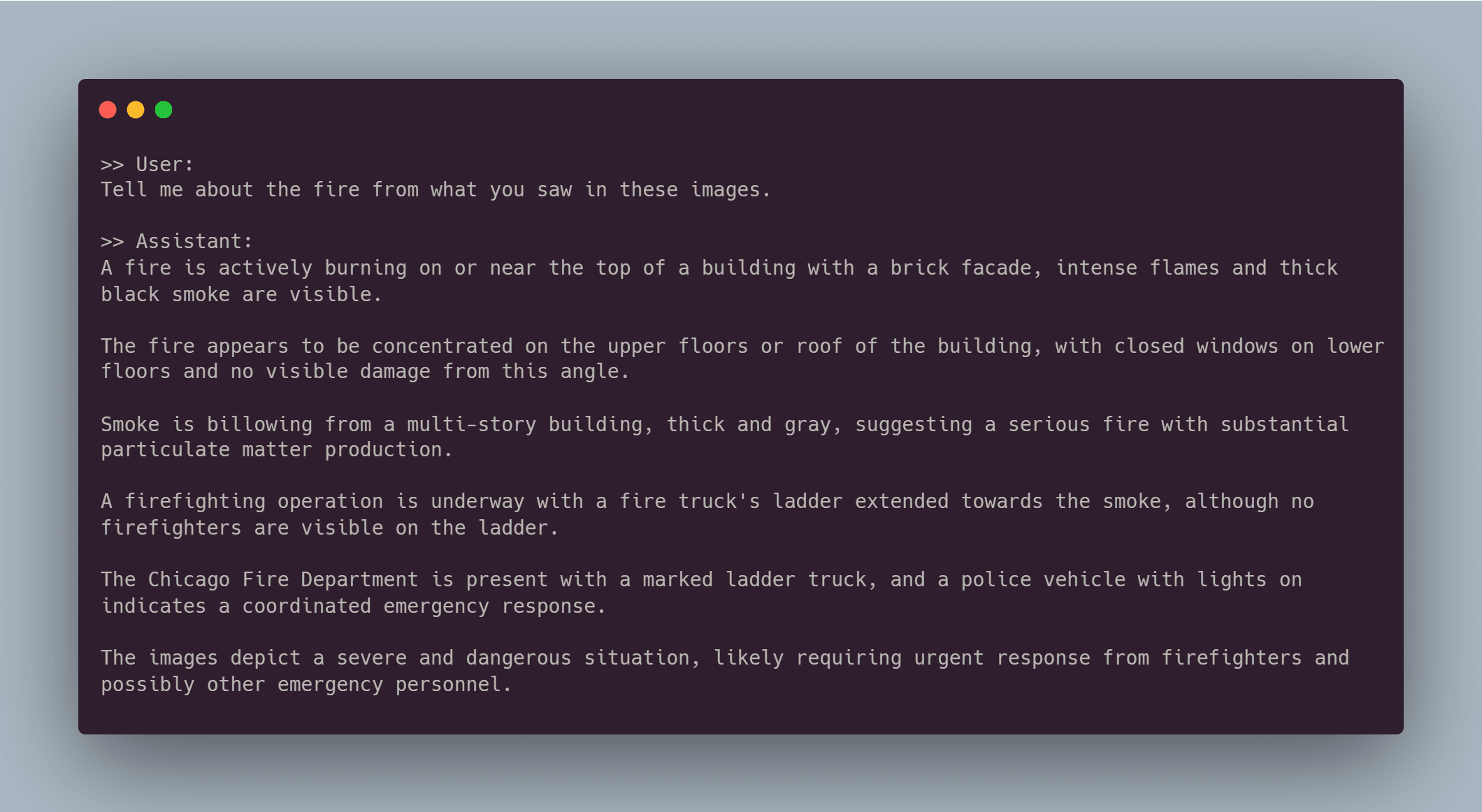 GPT-4 Vision responds with detailed analysis of the fire scene.