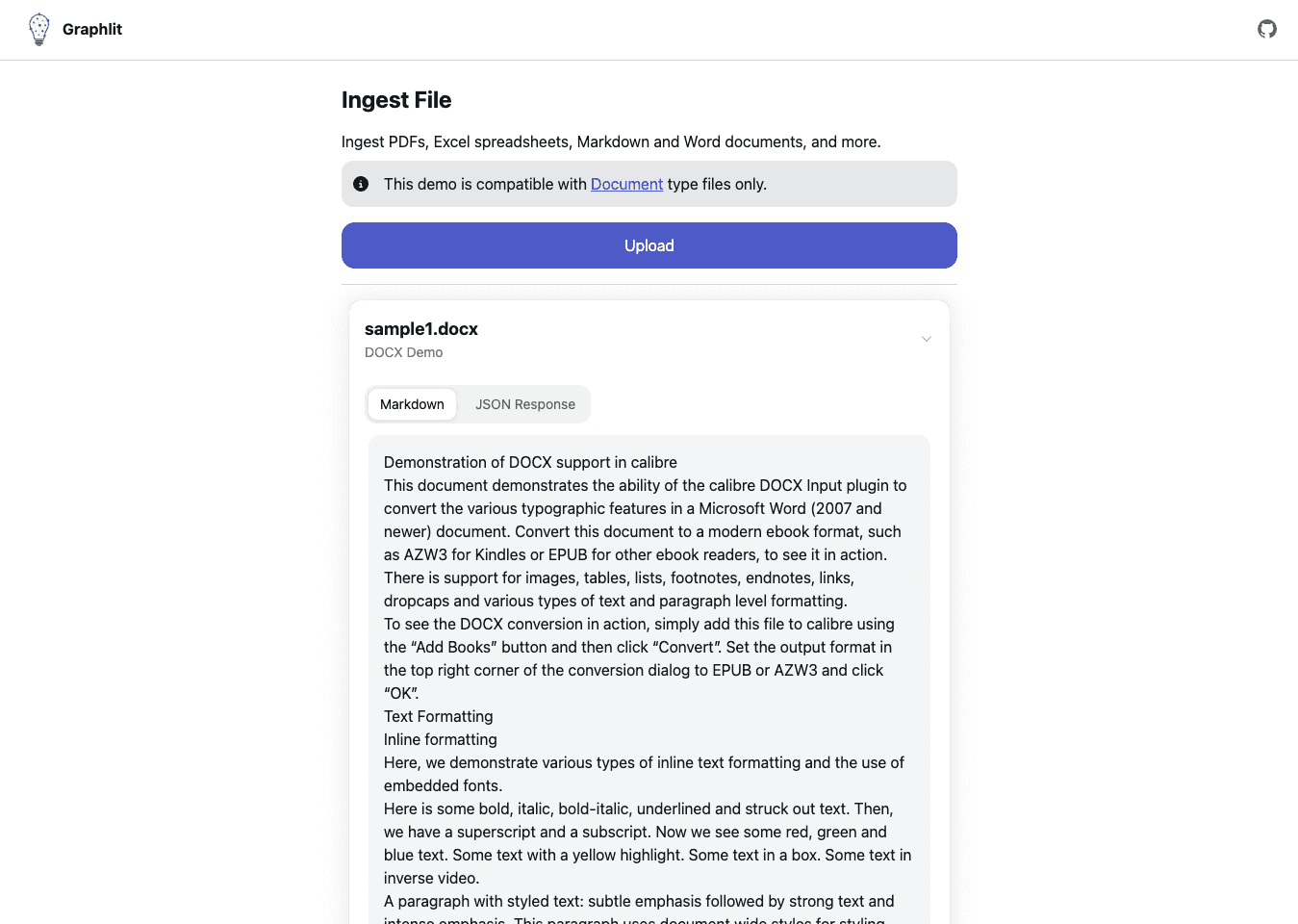 Similar to the Chat sample application, the File Extraction application demonstrates how to upload a local file. Once ingested, the application displays the extracted Markdown text and structured JSON output.
