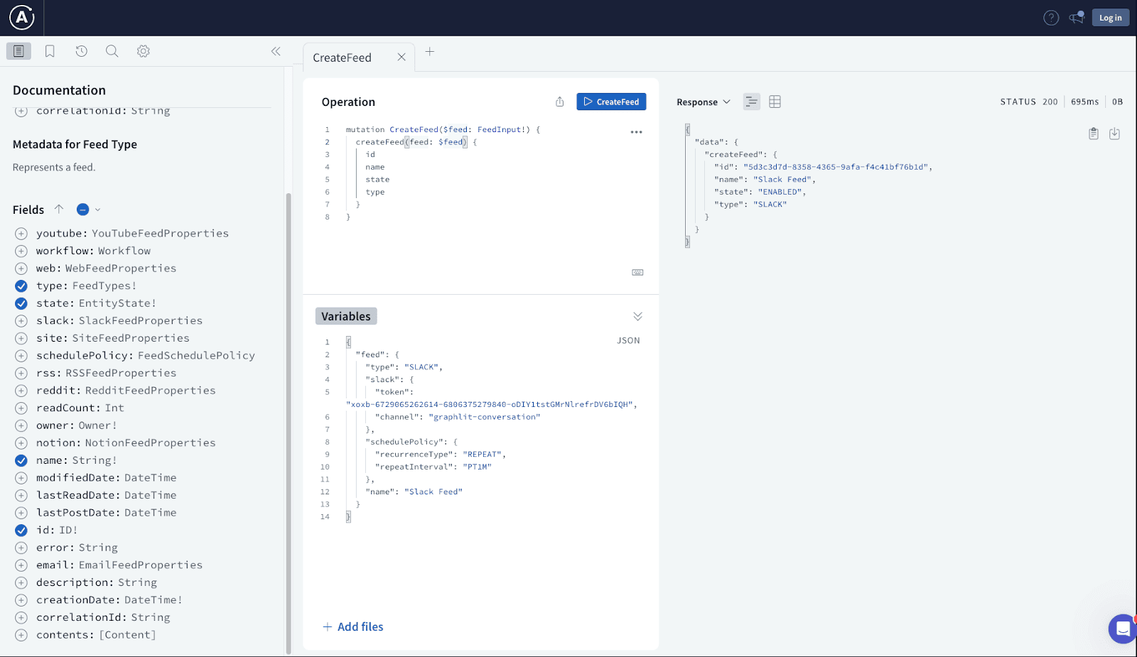 We will use the createFeed mutation via the API Explorer. API Explorer provides an in-browser IDE within your Graphlit project that you can use to run your GraphQL queries or mutations.