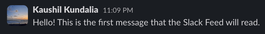 "text": "Slack Message:\n- From: Kaushil Kundalia\n- Created at 3/24/2024 5:39:21 AM UTC\nHello. This is the first message that the Slack Feed will read."