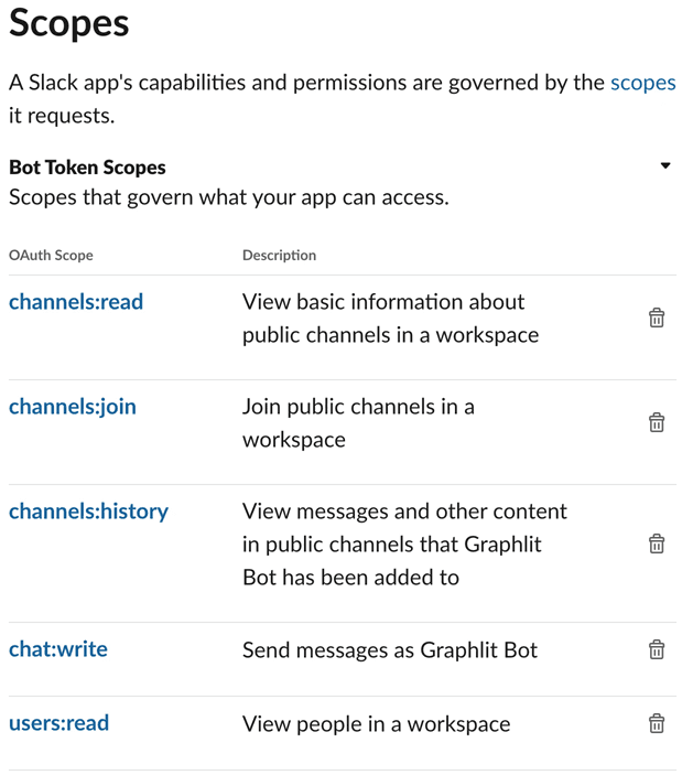 Next step is to grant permission that will allow our Graphlit powered app to communicate with Slack via our newly created app. Head over to “OAuth and Permissions”, and add the following “Bot Token Scopes”: