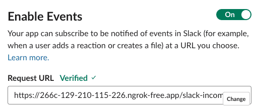 Next step is to tell Slack about the endpoint on which it will make a POST request whenever an event occurs. Here, we will use the URL that Ngrok created. First turn on the Event Subscriptions and paste the URL (make sure you include the /slack-incoming endpoint).