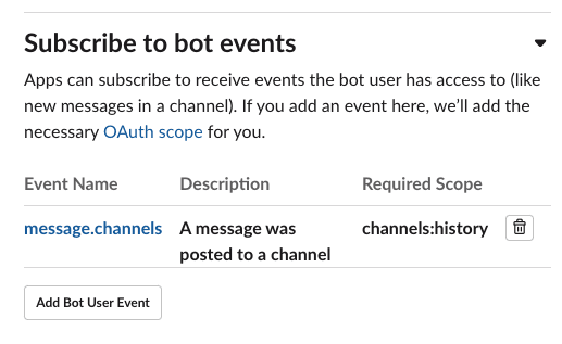 Once the URL is verified, will subscribe to new messages coming in a channel. To do this, subscribe to the message.channels event.