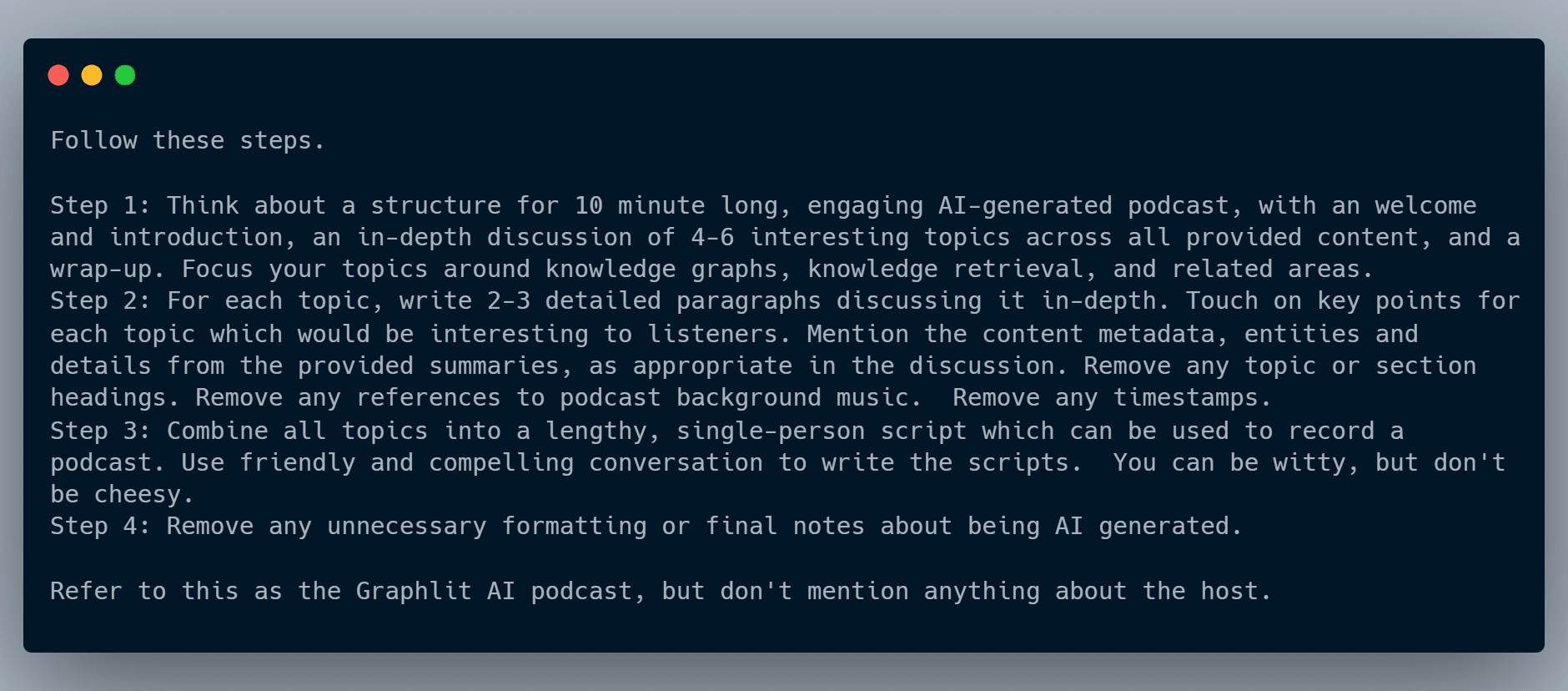 "publishPrompt": "Follow these steps.\\n\\nStep 1: Think about a structure for 10 minute long, engaging AI-generated podcast, with an welcome and introduction, an in-depth discussion of 4-6 interesting topics across all provided content, and a wrap-up. Focus your topics around knowledge graphs, knowledge retrieval, and related areas.\\nStep 2: For each topic, write 2-3 detailed paragraphs discussing it in-depth. Touch on key points for each topic which would be interesting to listeners. Mention the content metadata, entities and details from the provided summaries, as appropriate in the discussion. Remove any topic or section headings. Remove any references to podcast background music. Remove any timestamps.\\nStep 3: Combine all topics into a lengthy, single-person script which can be used to record a podcast. Use friendly and compelling conversation to write the scripts. You can be witty, but don't be cheesy.\\nStep 4: Remove any unnecessary formatting or final notes about being AI generated. \\n\\nRefer to this as the Graphlit AI podcast, but don't mention anything about the host.",