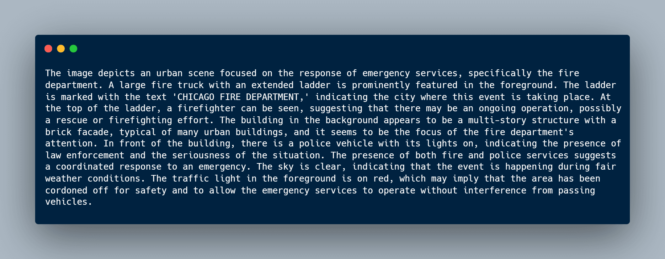 We can use the GPT-4 Vision model to provide a detailed description of images, like this example. Notice how it recognized the text "Chicago Fire Department" from the ladder, as well as recognizing the police vehicle.