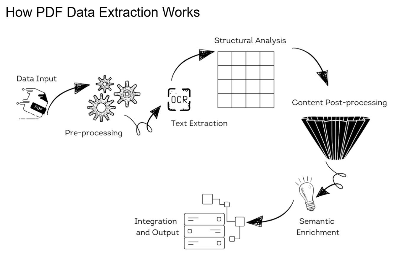 To overcome these challenges, effective PDF data extraction employs a variety of techniques and technologies, typically involving several stages: